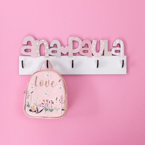 Perchero super mono de madera con el nombre de tu bebé! Viene con 5 ganchos para que cuelgues accesorios, ropita, juguetitos, etc. Por la parte de atrás viene con perforaciones para que lo puedas colgar.