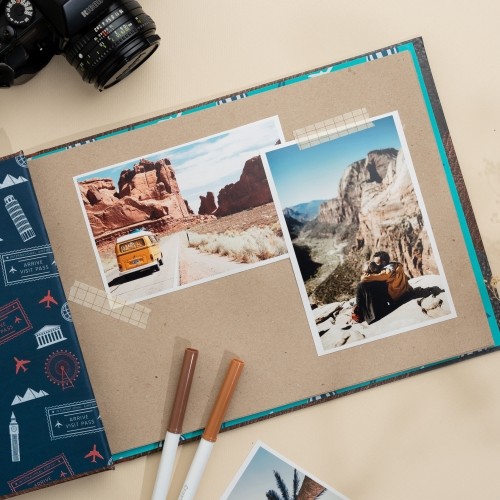 Incluye: 2 portadas rígidas con letras realzadas, 20 hojas color craft, 2 planillas de stickers para decorar y 4 planillas con 240 de esquineros para fotos