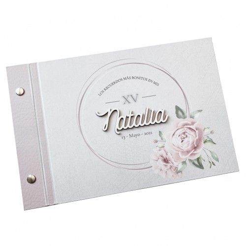 Álbum de XV personalizado con nombre en la portada y fecha del evento para que decores con fotos y tus invitados escriban sus buenos deseos el día de la boda. Con este álbum puedes guardar un recuerdo muy bonito con todos los deseos de amor y felicidad de tus invitados que te acompañaron en este día tan especial: fotos, momentos, dedicatorias y bonitos deseos... Material: impresión matte en alta resolución, material de portada resistente a salpicaduras (puedes limpiarlo con un trapo húmedo), fijado con herrajes metálicos que lo hacen super duradero y muy elegante. Medida: 33.5 cm ancho x 23 cm de alto. Que incluye la compra? Caja de cartón para que puedas guardarlo, Álbum de portadas ultrarígidas y personalización de nombres en la portada realzados, Incluye 20 hojas rígidas con diferentes diseños, 2 planillas de stickers para que tus invitados decoren sus mensajes llenos de buenos deseos, Esquineros para fotos (240 esquineros en total).