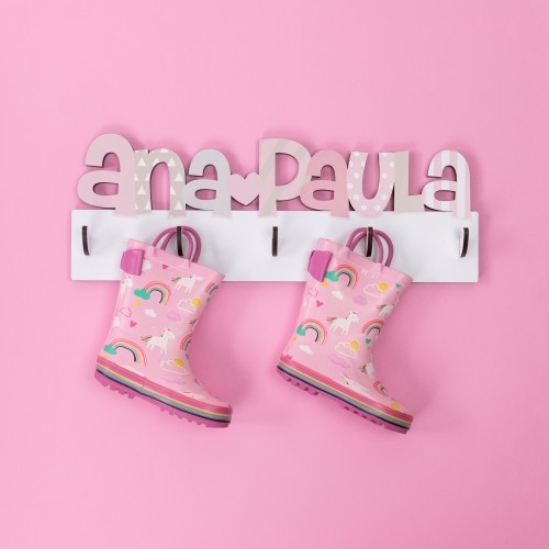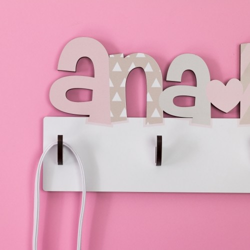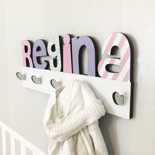 Perchero super mono de madera con el nombre de tu bebé! Viene con 5 ganchos para que cuelgues accesorios, ropita, juguetitos, etc. Por la parte de atrás viene con perforaciones para que lo puedas colgar.