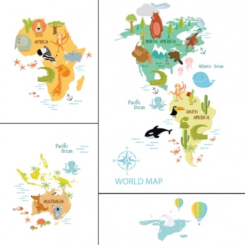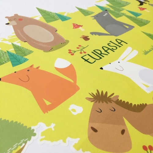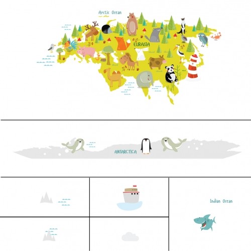Decora la recámara de tus niños con este vinil de mapamundi con animalitos.
